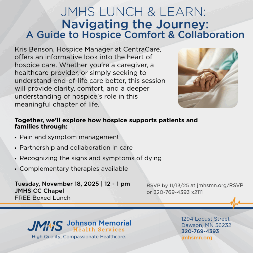 Thank you for registering for our JMHS Lunch & Learn session. The event is from 12:00 – 1:00 pm in the JMHS Conference Room, which is located to the left of the main clinic/hospital entrance. A FREE lunch will be provided along with coffee, water, and lemonade. Please contact Kristyn Wicht at 320-312-2111 with any questions.